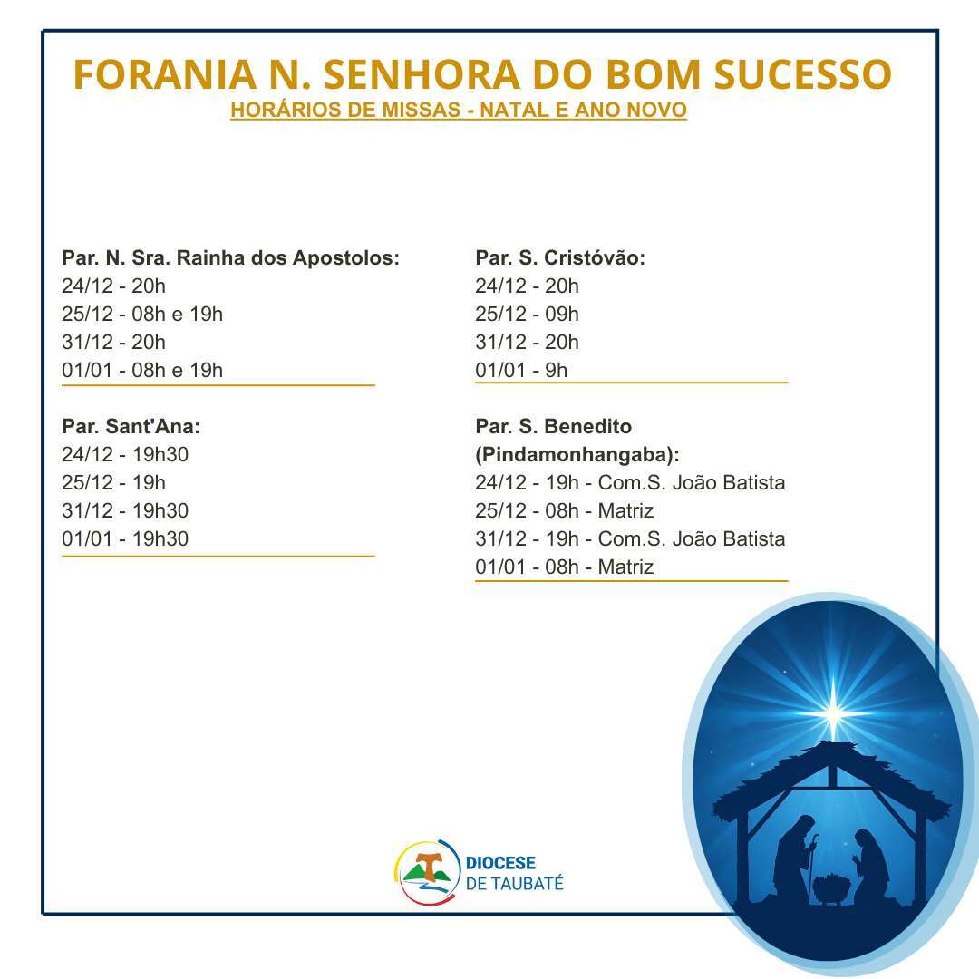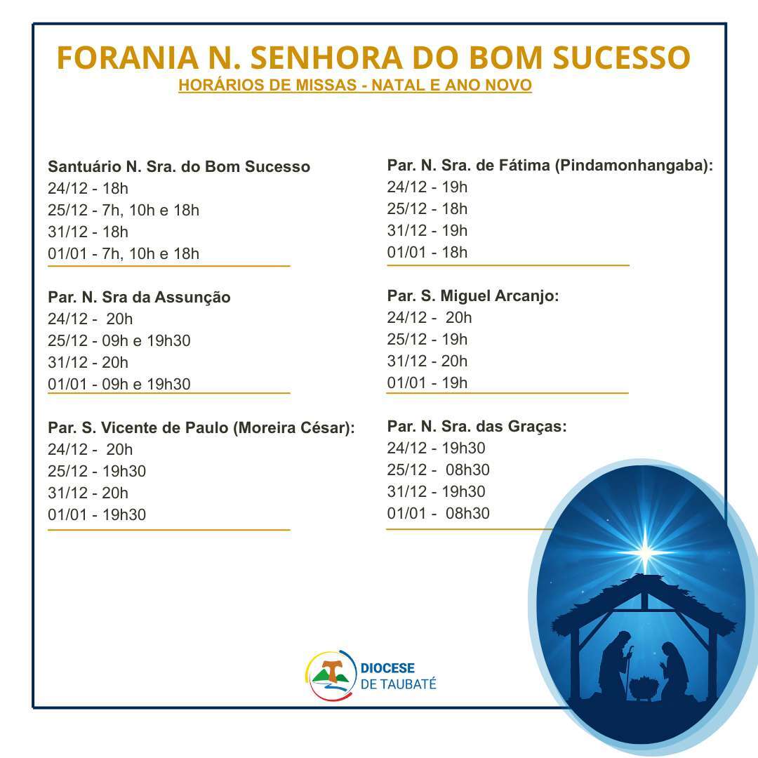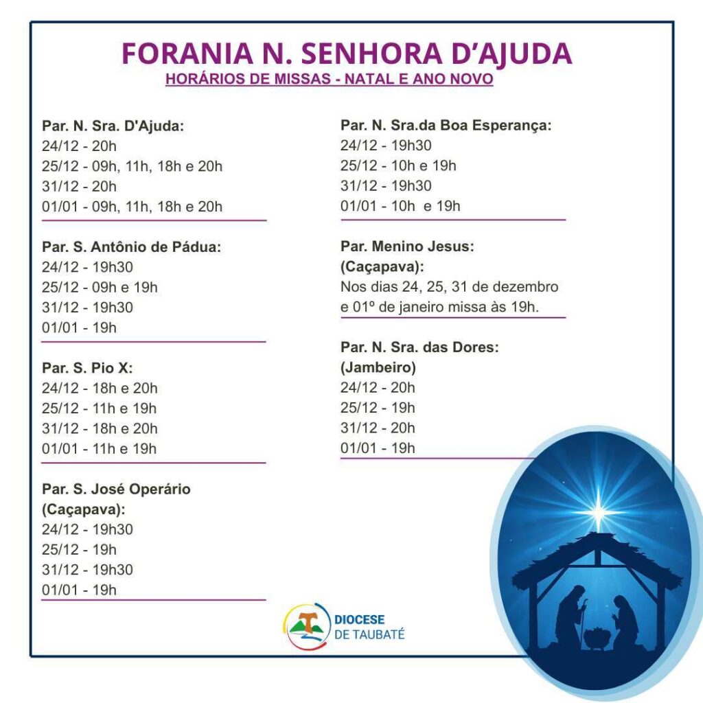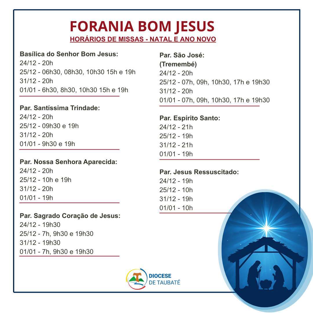 Participe da Santa Missa, confira os horários de missa de Natal e Ano Novo nas paróquias da Diocese de Taubaté.