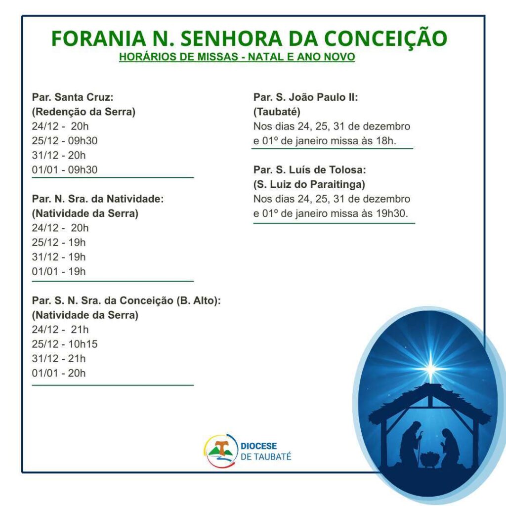 Horários de Missa das Paróquias da Forania Nossa Senhora da Conceição (Taubaté, Redenção da Serra, Natividade da Serra e São Luiz do Paraitinga):