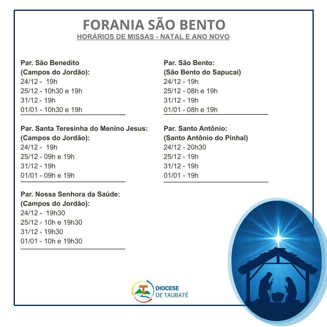 Horários de Missa das Paróquias da Forania São Bento (Campos do Jordão, Santo Antônio do Pinhal e São Bento do Sapucaí):