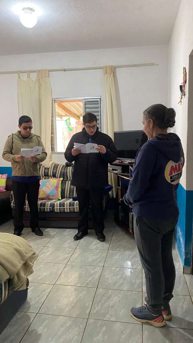 Por isso, dois a dois, fomos enviados para diferentes bairros de Natividade, visitando famílias e enfermos, para ser sinal e presença de Cristo e da Igreja. Com Bíblia numa mão e água benta na outra, pudemos visitar mais de cem casas e comércios no Centro da cidade, no Bairro da Marmelada, Selado, Vargem Grande e Palmeiras, Bairro Alto e Pouso Alto, partilhando a Palavra de Deus e colocando sob Sua proteção todos esses lares e locais de trabalho.